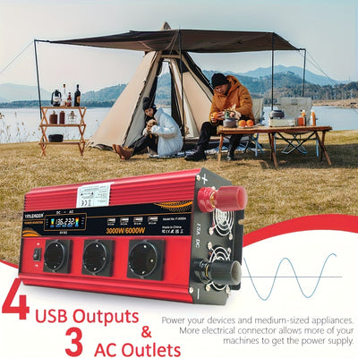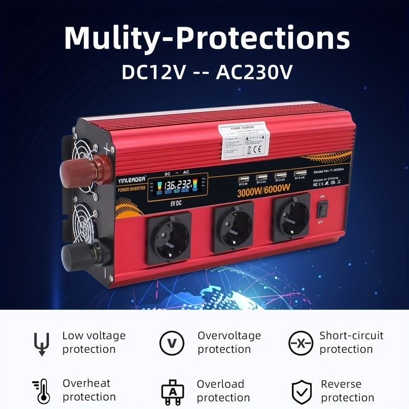 LVYUAN 12V 230V 3000W Spannungswandler Fernbedienung 4X USB und LCD 3 AC Steckdosen für Solarpanel Auto Camper/6000W, ohne Batterie