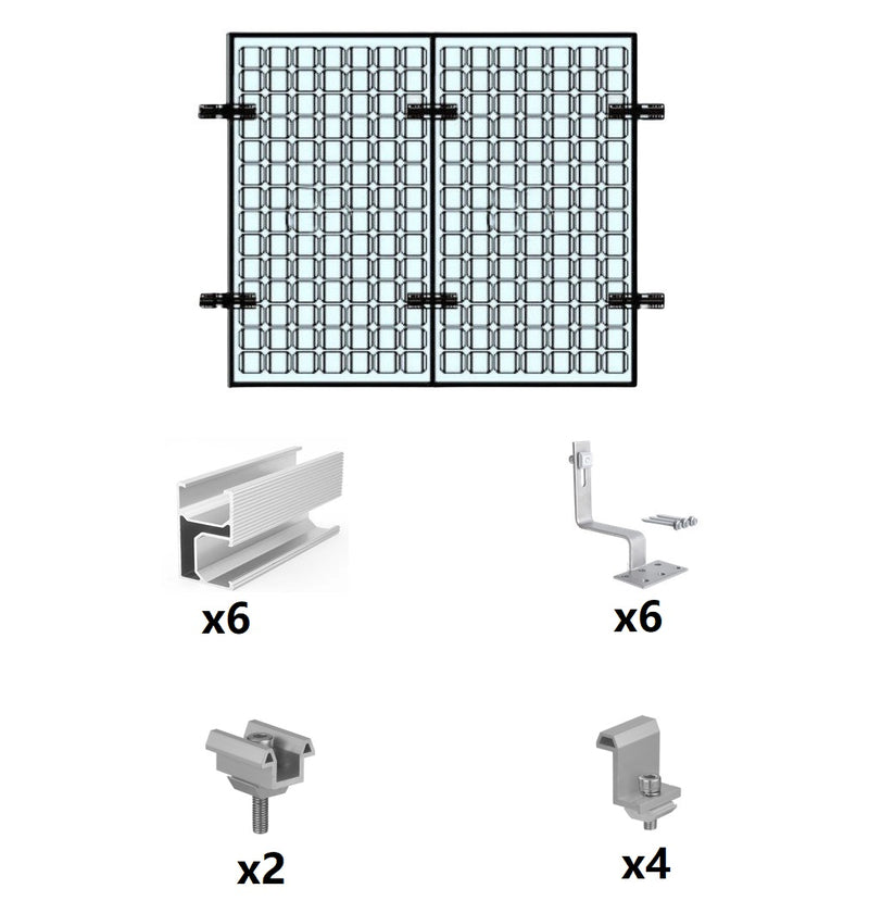 Für 2-Solarpanel benötigen Sie 6x Schiene 4x Endklemme 2x Mittelklemme 6x Dachhaken