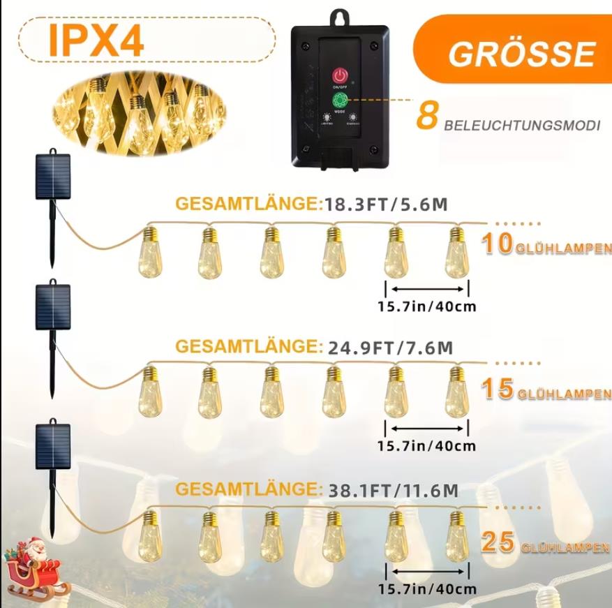 - IP44 Wasserdicht & Bruchsicher: Diese für den Außenbereich konzipierten wasserdichten IP44 solarlichterkette widerstehen Regen und Feuchtigkeit. Sicheren G40 Glühbirnen sind aus bruchsicherem Kunststoff gefertigt. Ihre robuste Konstruktion verhindert Bruch und reduziert die Notwendigkeit eines häufigen Austauschs. Die solar für außen garten lichterkette sind ideal für den Außen- und Innenbereich.