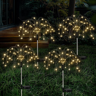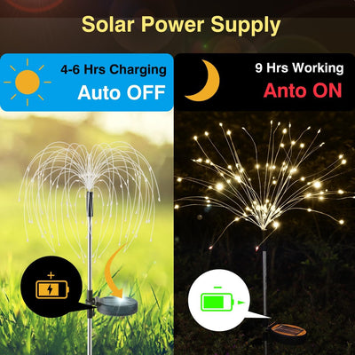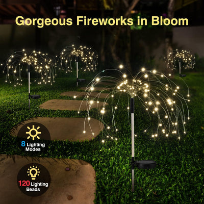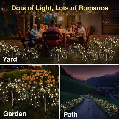 - 【Weit verbreitete Gartendekorationen für draußen】: Mit IP65 wasserdicht Leistung, kann jedes Wetter widerstehen, wenn im Freien verwendet. Diese Solarfeuerwerk Lichter sind eine gute Wahl für Hausdekoration, Landschaft, Garten, Hof, Einfahrt, Weg, Gehweg, Feiertagsdekoration und so weiter.